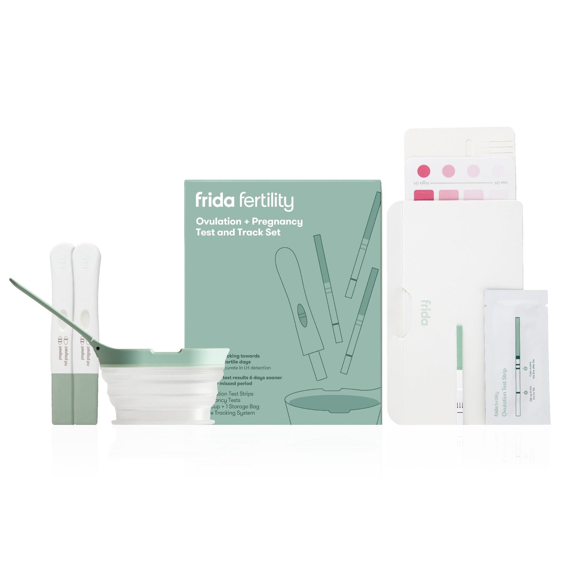 The Frida Fertility Ovulation and Pregnancy Test + Track Set is a reimagined daily tracking system, designed with the discretion, accuracy and simplicity that you need + want while TTC. So you can test and know when your 24-48 hour babymaking window is open to maximize your chances of conceiving. Then, find out if you're pregnant with 99% accuracy and 5-6 days before your period. •HOW IT WORKS: Test and know when your 24-48 hour babymaking window (aka LH surge) is open to maximize your chances of conceiving. No more hacks or guesswork required. •WTF IS LH?: Cause you might not know... When the Luteinizing Hormone [LH] in your body begins to rise, it signals to your brain that it’s time to release an egg. •OVULATION TEST: Detect in 3 minutes with over 99% accuracy and use our easy tracking system to find your 2 most fertile days. •PREGNANCY TEST: Detect in 5 minutes with over 99% accuracy 6 days before your missed period. •COLLAPSABLE PEE CUP: Portable + reusable so you can take it wherever you test, no pee on your hand again. |